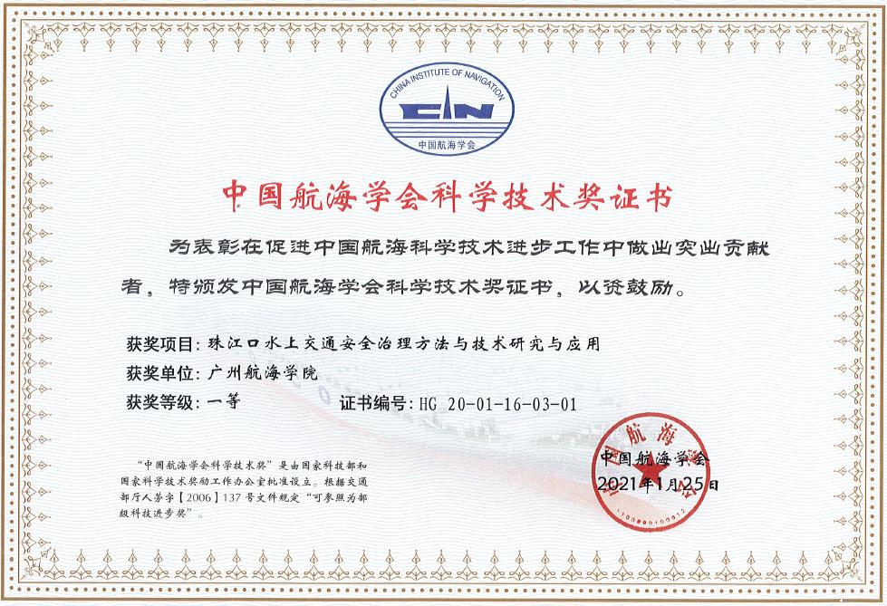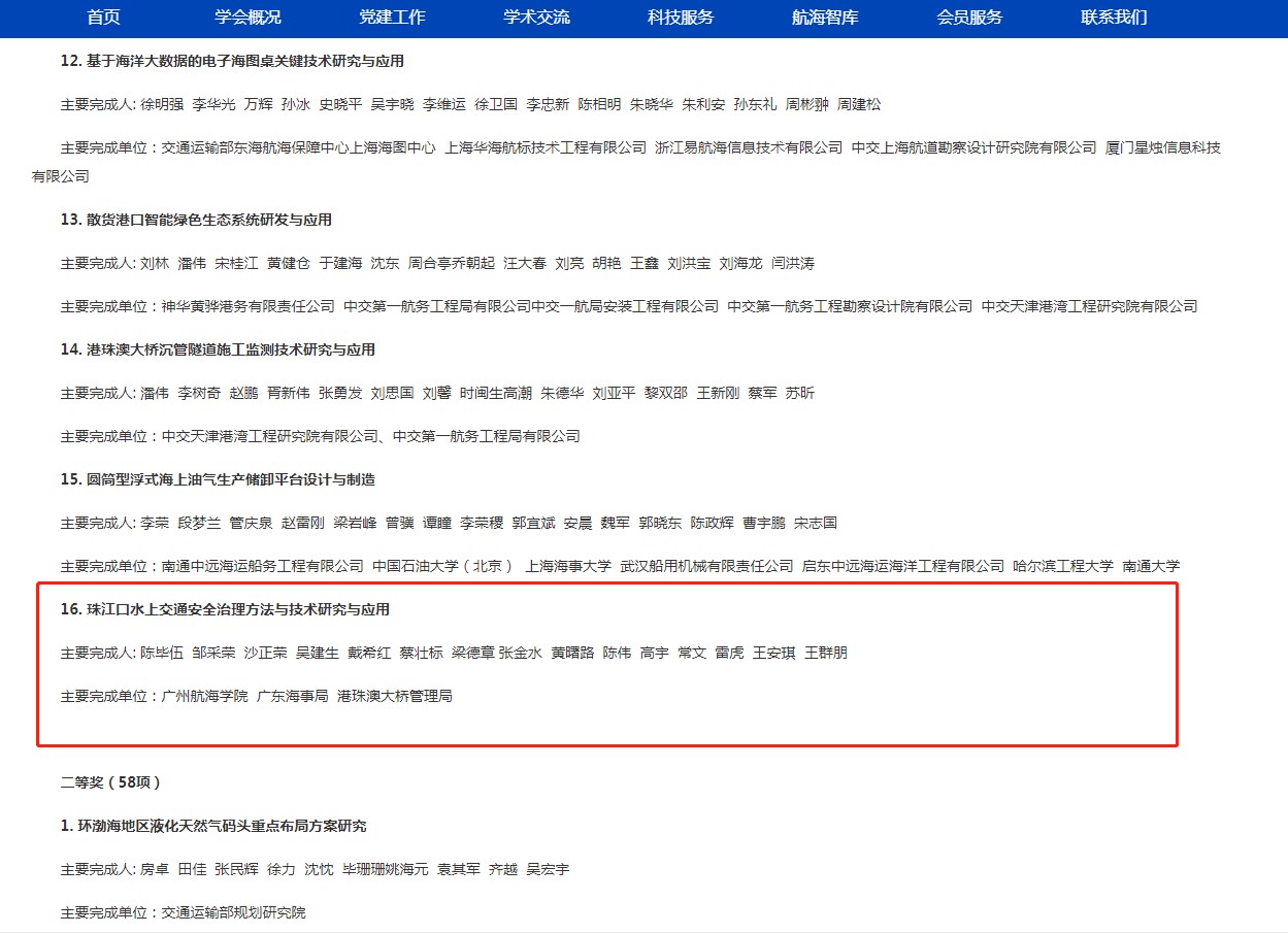3044AM永利集团作为第一申报单位,与广东海事局、港珠澳大桥管理局联合申报的项目《珠江口水上交通安全治理方法与技术研究与应用》荣获“中国航海学会科学技术进步一等奖”。