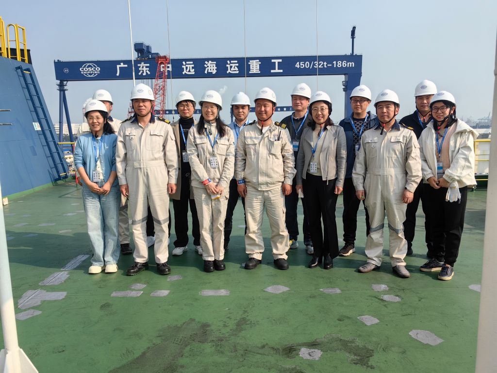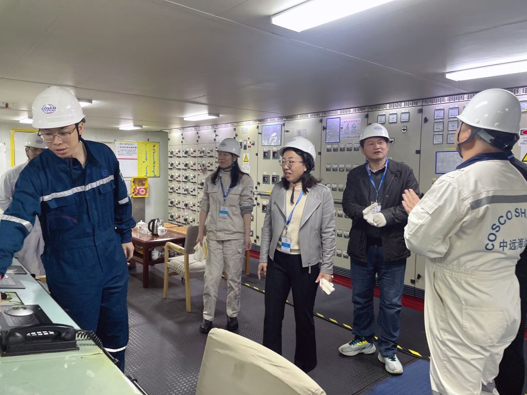 在雷雨的带领下,学院一行参观了“祥和口”号驾驶台与机舱。作为中远海运特运5万吨级半潜船旗舰,“祥和口”号配备DP2动力定位系统,可精准下潜至26米深度,装载面积达7650平方米,相当于1.1个标准足球场。通过参观,老师们近距离了解了船舶的航行指挥系统和先进的导航设备,实地感受了船舶动力系统的运行原理和半潜船通过压载水调节实现“沉浮自如”的技术原理,感受到大国重器的科技魅力。