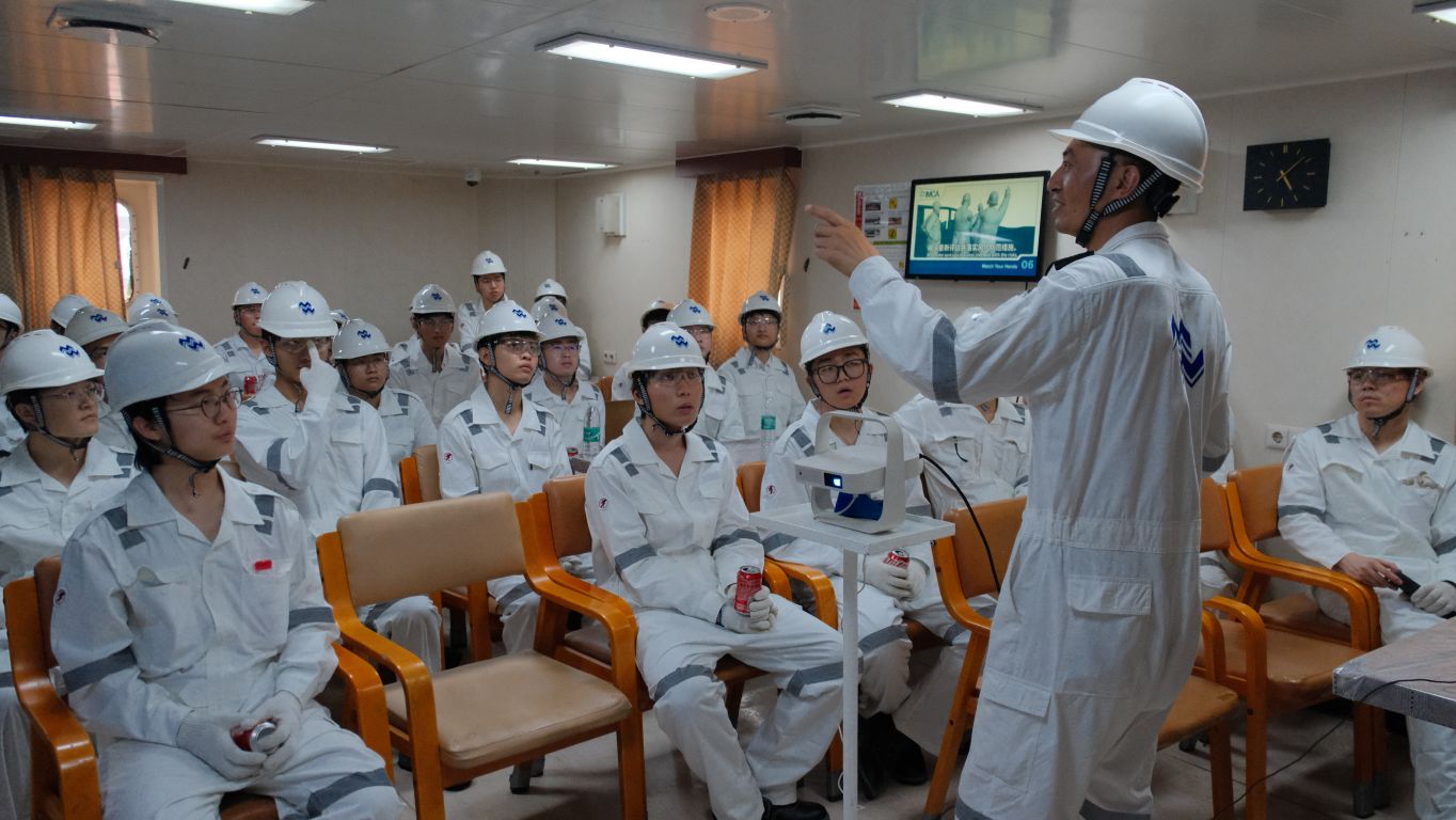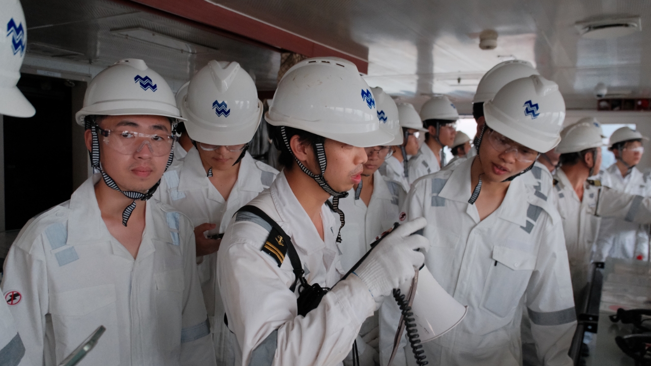 登轮前,“大周轮”船长王慧勇对师生们的到来表示热烈欢迎,介绍了船舶基本情况及船上工作分工。船厂安全员对师生们进行安全教育,详细讲解登轮安全及保密注意事项,为师生们筑牢安全防线。师生们有序换装并穿戴个人防护装备(PPE)后分组登轮,前往驾驶台、机舱和生活区学习体验,实地了解船舶关键部位、运行原理与船员生活环境。